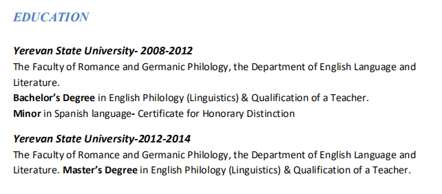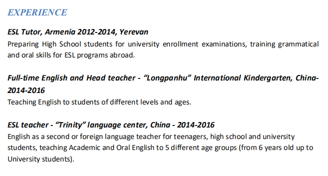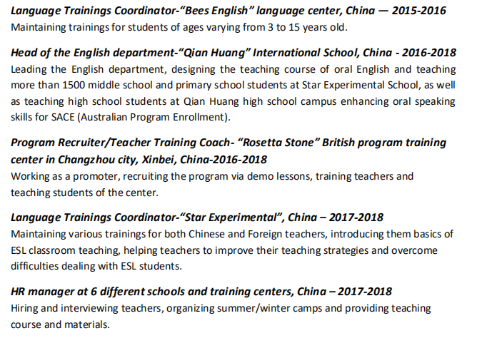 教育 埃里溫州立大學(xué)- 2008-2012年 浪漫和日耳曼語文學(xué)系,英語語言和文學(xué)系 文學(xué)。 英語語言學(xué)學(xué)士學(xué)位&教師資格。 西班牙語輔修-榮譽(yù)證書 埃里溫州立大學(xué)-2012-2014 浪漫和日耳曼語文學(xué)系,英語語言和文學(xué)系 文學(xué)。英語語言學(xué)碩士學(xué)位&教師資格。 經(jīng)驗(yàn) 埃里溫亞美尼亞2012-2014年英語教師 為高中生準(zhǔn)備大學(xué)入學(xué)考試,訓(xùn)練語法 和口語技能。 全職英語和班主任——“龍?bào)春眹H幼兒園,中國- 2014-2016 給不同水平和年齡的學(xué)生教英語。 ESL教師——“三一”語言中心,中國- 2014-2016 青少年、高中和大學(xué)的英語第二語言或外語教師 學(xué)生,教授5個不同年齡組(從6歲到 大學(xué)生)。 語言培訓(xùn)協(xié)調(diào)員——“蜜蜂英語”語言中心,中國——2015-2016年 保持對3至15歲學(xué)生的培訓(xùn)。 中國黃倩國際學(xué)校英語系系主任,2016-2018年 領(lǐng)導(dǎo)英語系,設(shè)計(jì)英語口語教學(xué)課程和教學(xué) 明星實(shí)驗(yàn)學(xué)校的1500多名中小學(xué)生 在黃倩高中校園教高中生加強(qiáng)口語 SACE技能(澳大利亞項(xiàng)目注冊)。 項(xiàng)目招聘人員/教師培訓(xùn)蔻馳——“羅塞塔石碑”英國項(xiàng)目培訓(xùn) 中國新北常州市中心-2016-2018 作為推廣人員,通過演示課程、培訓(xùn)教師和 教中心的學(xué)生。 語言培訓(xùn)協(xié)調(diào)員——“明星實(shí)驗(yàn)”,中國——2017-2018 保持對中外教師的各種培訓(xùn),向他們介紹 英語課堂教學(xué),幫助教師改進(jìn)教學(xué)策略,克服 與ESL學(xué)生打交道的困難。 2017-2018年,中國6所不同學(xué)校和培訓(xùn)中心的人力資源經(jīng)理 招聘和面試教師,組織夏令營/冬令營,提供教學(xué) 課程和材料。 |