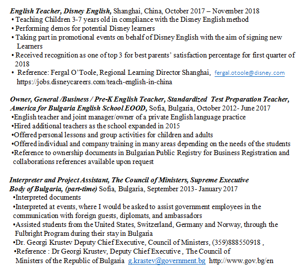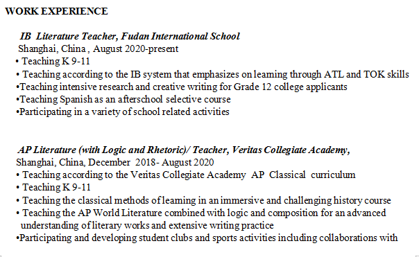 自我介紹,介紹國(guó)籍, 9年教學(xué)經(jīng)驗(yàn),去年開(kāi)始在上海工作和生活,目前在找個(gè)新工作---經(jīng)驗(yàn)非常豐富