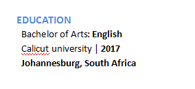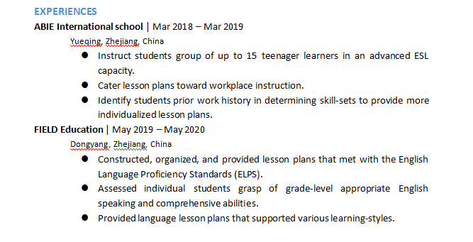 經(jīng)驗 ABIE國際學(xué)校| 2018年3月– 2019年3月 中國浙江樂清 ?以先進的ESL能力指導(dǎo)最多15名青少年學(xué)習(xí)者的學(xué)生群體。 ?針對工作場所教學(xué)的課程計劃。 ?確定學(xué)生以前的工作經(jīng)歷,以確定技能,以提供更個性化的課程計劃。 現(xiàn)場教育| 2019年5月– 2020年5月 中國浙江省東陽市 ?構(gòu)造,組織并提供符合英語水平標(biāo)準(zhǔn)(ELPS)的課程計劃。 ?評估個人學(xué)生掌握年級適當(dāng)?shù)挠⒄Z口語和綜合能力。 ?提供支持各種學(xué)習(xí)方式的語言教學(xué)計劃。 教育 文學(xué)學(xué)士:英語 卡利卡特大學(xué)| 2017年 南非約翰內(nèi)斯堡 |