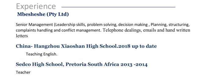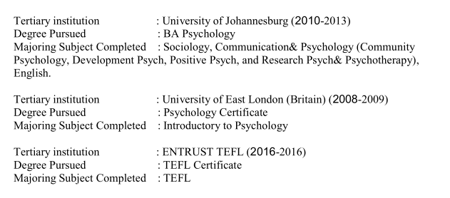 高等院校:約翰內斯堡大學(2010-2013) 攻讀學位:心理學學士 已修專業(yè):社會學、傳播學與心理學(社區(qū) 心理學,發(fā)展心理學,積極心理學,心理與心理治療研究), 英語。 高等院校:東倫敦大學(英國)(2008-2009) 攻讀學位:心理學證書 主修科目完成:心理學導論 委托TEFL (2016-2016) 學歷:外語教學證書 主修科目:外語教學 經驗 Mbesheshe(企業(yè)有限公司) 高級管理(領導能力,問題解決,決策,計劃,結構, 投訴處理及沖突管理。電話交易,電子郵件信 中國-杭州蕭山中學。2018年至今 教英語。 賽德科高中,南非比勒陀利亞2013 -2014 老師 |