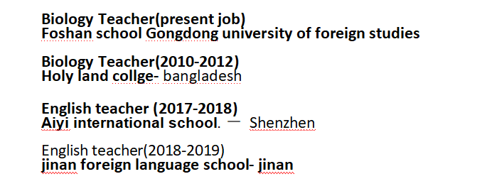孟加拉國籍,美國加利福尼亞大學(xué)本科,TESOL,現(xiàn)在在佛山,生物老師,4年左右經(jīng)驗,求職寒假過后公立學(xué)校職位,2月左右