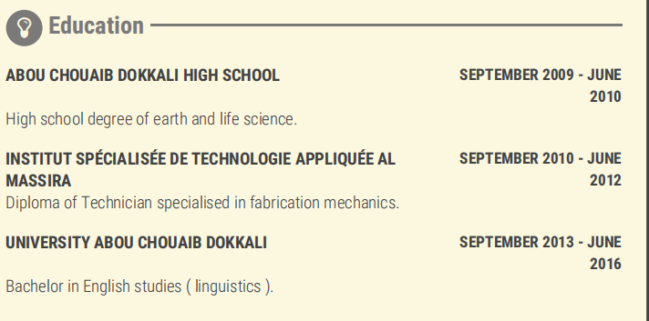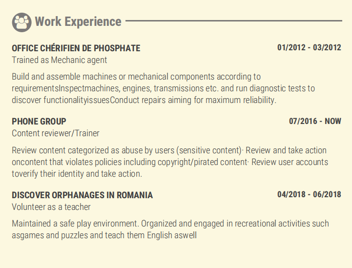 2009年9月至2010年6月 地球與生命科學高中學位。 2010年9月-2012年6月 INSTITUT spéCIALISEéE DE TECHNOLOGIES appliquéE AL MASSIRA 制造機械專業(yè)技師文憑。 2013年9月至2016年6月 英語研究(語言學)學士。 工作經(jīng)歷 2012年3月1日 受訓成為機械師 根據(jù)要求制造和組裝機器或機械部件。檢查機器、發(fā)動機、變速器等。并運行診斷測試以發(fā)現(xiàn)功能問題進行旨在實現(xiàn)最大可靠性的維修。 電話集團07/2016 -現(xiàn)在 內(nèi)容審查者/培訓師 審查被歸類為用戶濫用的內(nèi)容(敏感內(nèi)容)審查違反策略(包括版權(quán)/盜版內(nèi)容)的內(nèi)容并采取措施審查用戶帳戶以驗證其身份并采取措施。 發(fā)現(xiàn)羅馬尼亞的孤兒院2018年4月-2018年6月 志愿當老師 保持了一個安全的游戲環(huán)境。組織并參與娛樂活動,如游戲和智力游戲,并教他們英語 |