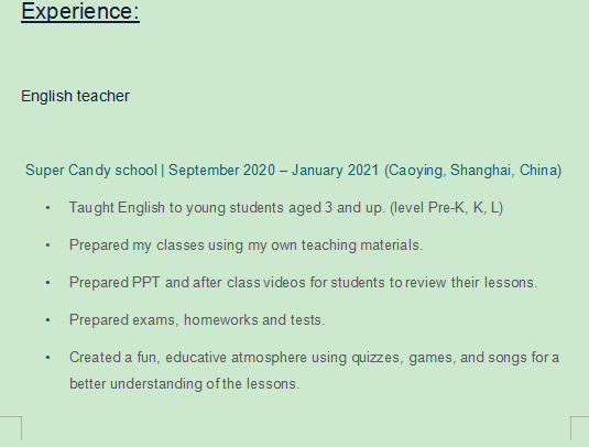 自我介紹,介紹一年半中國教學經(jīng)驗,加上本國4年多,喜歡孩子,熱愛教育,開朗活潑---發(fā)音好,性格好