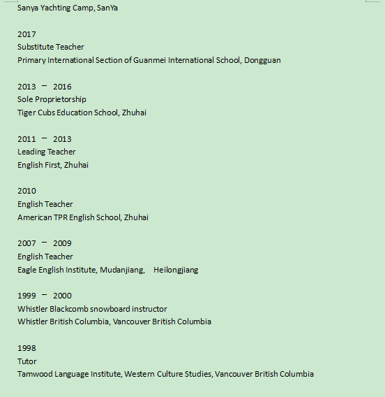 自我介紹,介紹中國10多年教學(xué)經(jīng)歷,目前在珠海,有創(chuàng)業(yè),但更喜歡教學(xué)