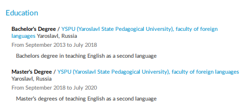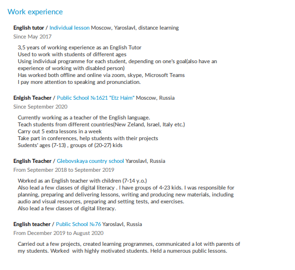 教育經(jīng)歷 2013年9月至2018年7月 俄羅斯雅羅斯拉夫爾外國(guó)語(yǔ)學(xué)院教育學(xué)士學(xué)位 雅羅斯拉夫爾國(guó)立師范大學(xué)英語(yǔ)作為第二語(yǔ)言教學(xué)學(xué)士學(xué)位 俄羅斯雅羅斯拉夫爾外國(guó)語(yǔ)學(xué)院碩士學(xué)位 工作經(jīng)歷 2018年9月至2020年7月 英語(yǔ)作為第二語(yǔ)言教學(xué)碩士學(xué)位工作經(jīng)驗(yàn)英語(yǔ)導(dǎo)師/個(gè)人課莫斯科,雅羅斯拉夫爾 遠(yuǎn)程學(xué)習(xí)自2017年5月以來(lái),有3.5年的英語(yǔ)家教工作經(jīng)驗(yàn)。曾與不同年齡的學(xué)生一起工作。根據(jù)個(gè)人目標(biāo),為每個(gè)學(xué)生制定單獨(dú)的計(jì)劃(也有與殘疾人一起工作的經(jīng)驗(yàn))。 曾通過(guò)zoom、skype、微軟團(tuán)隊(duì)在網(wǎng)下和網(wǎng)上工作。我更注重口語(yǔ)和發(fā)音。 2020年9月至今 英語(yǔ)教師/公立學(xué)校№1621 "Etz Haim "莫斯科,俄羅斯自盡,目前從事英語(yǔ)教師工作。教來(lái)自不同國(guó)家的學(xué)生(新西蘭、以色列、意大利等)。) 每周額外上5節(jié)課參加會(huì)議,幫助學(xué)生完成他們的項(xiàng)目學(xué)生年齡(7-13歲),小組(20-27歲) 從2018年9月到2019年9月 兒童英語(yǔ)教師/俄羅斯雅羅斯拉夫爾格勒波夫斯卡婭鄉(xiāng)村學(xué)校 作為一名英語(yǔ)教師與兒童(7-14歲)一起工作。還領(lǐng)導(dǎo)了幾個(gè)數(shù)字掃盲班。我有4-23個(gè)孩子一組。我負(fù)責(zé)計(jì)劃、準(zhǔn)備和交付課程、編寫(xiě)和制作新材料,包括視聽(tīng)資源、準(zhǔn)備和設(shè)置測(cè)試以及練習(xí)。也領(lǐng)導(dǎo)幾個(gè)班的數(shù)字素養(yǎng)。 從2019年12月至2020年8月 英語(yǔ)教師/俄羅斯雅羅斯拉夫爾第76公立學(xué)校 開(kāi)展了一些項(xiàng)目,制定了學(xué)習(xí)計(jì)劃,與學(xué)生家長(zhǎng)進(jìn)行了大量溝通。與積極性很高的學(xué)生一起工作。舉辦了無(wú)數(shù)次公開(kāi)課。 |