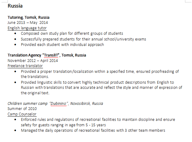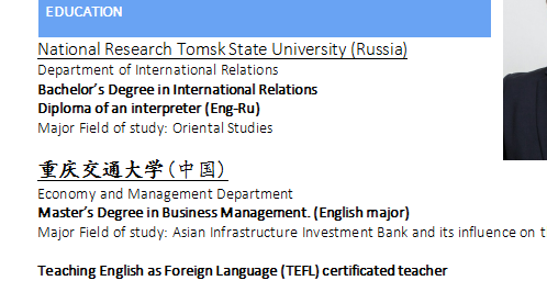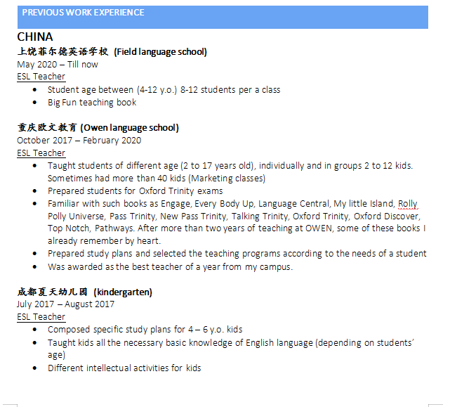 自我介紹,介紹在俄羅斯的教育背景和中國(guó)的教育背景,以及教學(xué)經(jīng)歷,2年多中國(guó)教學(xué)經(jīng)驗(yàn),學(xué)習(xí)能力強(qiáng),教學(xué)證書等等,學(xué)生年齡,并且獲得教學(xué)榮譽(yù)-----發(fā)音很好,性格活潑