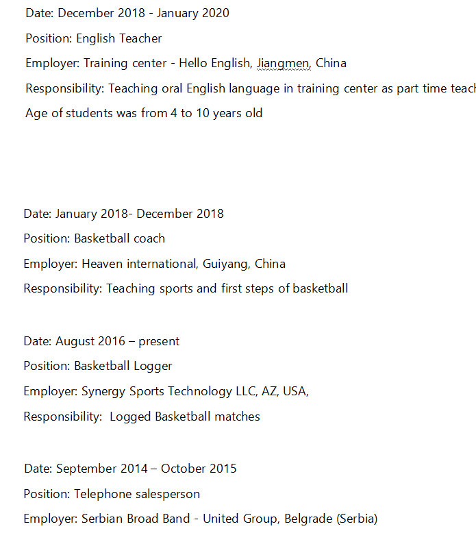 塞爾維亞, 目前在江門, 體育學(xué)院--籃球?qū)I(yè) --畢業(yè) 2010. 目前工作簽證資料齊全, 求職可以辦理 工作簽證的學(xué)校。 目前停留簽證。 |