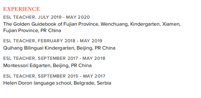 自我介紹,介紹年齡,國(guó)籍,學(xué)歷和專業(yè),北京,深圳和廈門都有工作經(jīng)歷。喜歡孩子,喜歡中國(guó)