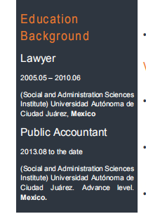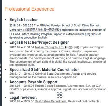 教育 背景 律師 2005.05 – 2010.06 (社會(huì)和行政科學(xué) 自治大學(xué) 墨西哥華雷斯市 會(huì)計(jì)師 2013.08至今 (社會(huì)和行政科學(xué) 自治大學(xué) 華雷斯城。進(jìn)階。 墨西哥。 專業(yè)經(jīng)驗(yàn) 英語教師 2018.05–2020.05華南師范大學(xué)附屬外國語學(xué)校 大學(xué)。(華南師范大學(xué)附屬外國語學(xué)校)實(shí)施的學(xué)術(shù)計(jì)劃 英語教學(xué)和牛津閱讀計(jì)劃。支持課外活動(dòng) 發(fā)展生產(chǎn)性英語。 英語教師/項(xiàng)目設(shè)計(jì)師 2017.04–2108.04自然思想有限公司(仟里仟尋)實(shí)施英語 在項(xiàng)目中給孩子們上課。創(chuàng)建、開發(fā)、實(shí)施, 評(píng)估和改進(jìn)兒童教育項(xiàng)目。聚焦戶外 環(huán)境,學(xué)習(xí)和練習(xí)英語語言的發(fā)展。 社交、智力、情感等軟技能(生活技能)的發(fā)展 和技術(shù)技能。 專業(yè)人員。材料協(xié)調(diào)員 2015.10–2016.12州刑事部。資產(chǎn)和服務(wù) 材料資源部門的管理。 應(yīng)付賬款支持。 2014.06–2015.06羅伯特·博世汽車系統(tǒng)有限公司 付款控制、相關(guān)批準(zhǔn)簽名、賬戶對(duì)賬、 等等。 法律審查員。 2008.09–2005.06房地產(chǎn)部。民事合同審查。 |