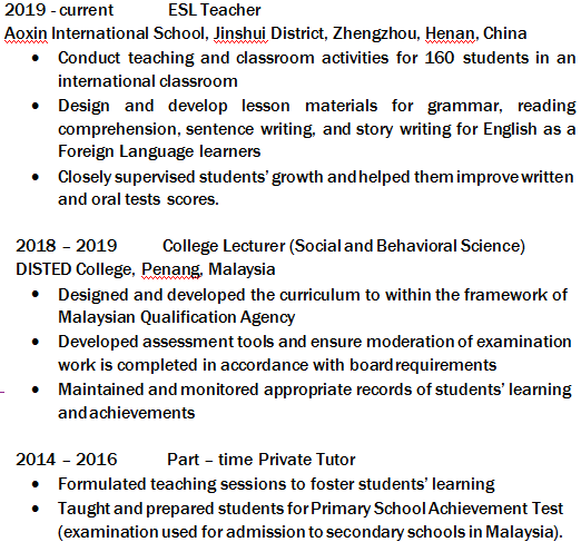國(guó)籍: 孟加拉 求職意向: 教師