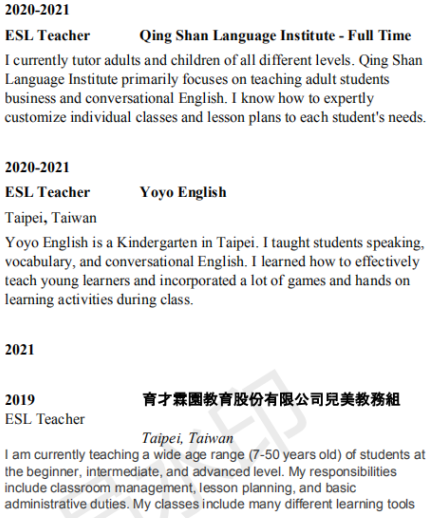 國籍: 其他 求職意向: 教師