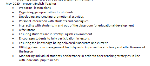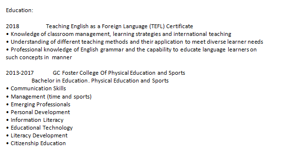 2016年9月– 2016年11月體育老師 橋港高中 ?確保每天準(zhǔn)備課程計(jì)劃 ?確保活動(dòng)領(lǐng)域有利于學(xué)習(xí) ?確保所教課程是最新且準(zhǔn)確的 ?在繼續(xù)學(xué)習(xí)下一個(gè)主題之前,學(xué)生應(yīng)該很好地接受課程 ?確保對任何計(jì)劃外的情況保持批判性思維和即興技巧的高度警覺 ?確保學(xué)生在學(xué)習(xí)時(shí)一起玩樂 ?確保所有學(xué)生都包括在課程和討論中 ?作為學(xué)習(xí)的促進(jìn)者和指導(dǎo)者被充分執(zhí)行 ?確保我和同事保持專業(yè)水平 2020年5月–至今英語老師 ?準(zhǔn)備課程計(jì)劃 ?為學(xué)生組織小組活動(dòng) ?開發(fā)和創(chuàng)建促銷活動(dòng) ?與學(xué)生和同事的個(gè)人互動(dòng) ?與教室內(nèi)外的學(xué)生互動(dòng)以促進(jìn)教育發(fā)展 ?主持人 ?確保學(xué)生處于嚴(yán)格的英語環(huán)境中 ?鼓勵(lì)學(xué)生充分參與課程 ?確保所傳遞的知識是準(zhǔn)確和最新的 ?利用教室管理技術(shù)來提高課程的效率和有效性 ?監(jiān)控個(gè)別學(xué)生的表現(xiàn),以便根據(jù)個(gè)別學(xué)生的需求改變教學(xué)策略 教育: 2018年英語作為外語教學(xué)(TEFL)證書 ?課堂管理,學(xué)習(xí)策略和國際教學(xué)方面的知識 ?了解不同的教學(xué)方法及其在滿足不同學(xué)習(xí)者需求方面的應(yīng)用 ?具有英語語法方面的專業(yè)知識,并具有以相關(guān)方式對語言學(xué)習(xí)者進(jìn)行此類概念教育的能力 2013-2017 教育學(xué)學(xué)士。 體育與體育 ? 溝通技巧 ?管理(時(shí)間和體育) ?新興專業(yè)人士 ? 個(gè)人發(fā)展 ?信息素養(yǎng) ?教育技術(shù) ?素養(yǎng)發(fā)展 ?公民教育 |