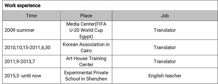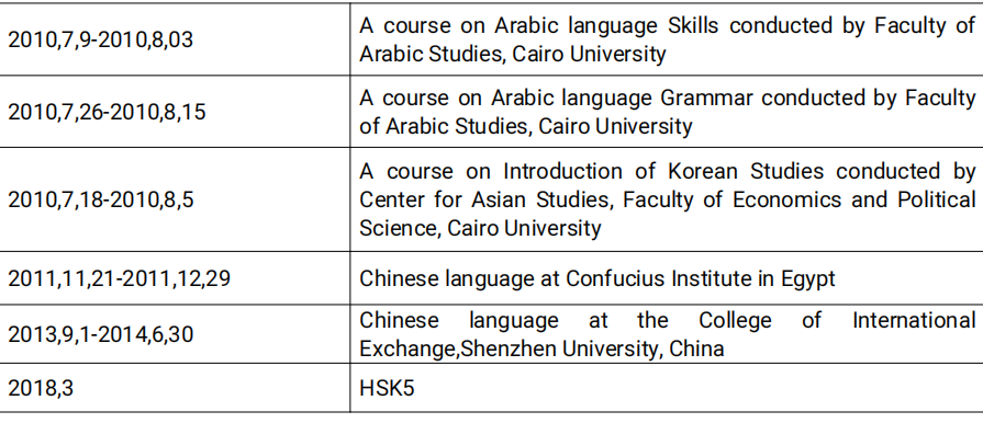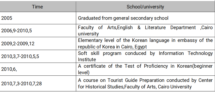 教育 2006年9月至2010年5月,開羅大學(xué)英國文學(xué)系文學(xué)院畢業(yè) 工作 2009年夏季媒體中心(國際足聯(lián)U-20世界杯埃及) 翻譯 2010年10月15日至2011年6月30日開羅公司的韓國社會 翻譯 2011,9-2013,7亞瑟王訓(xùn)練中心 翻譯 2015年3月至今深圳實驗私立學(xué)校 英語老師 |