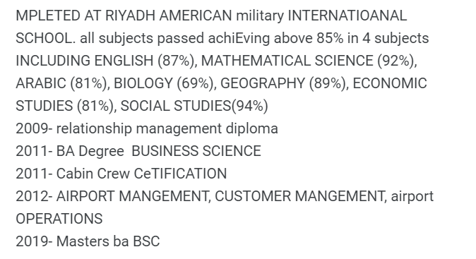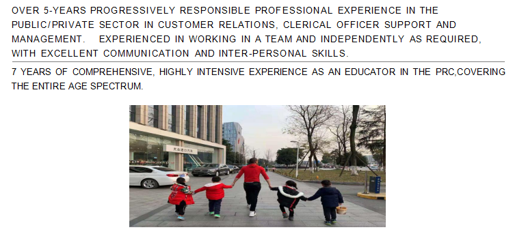 2011-商科學士學位 2011-機組人員認證 2012-機場管理,客戶管理,機場運營 2019-碩士學士BSC 在公共/私營部門的客戶關(guān)系,文職人員支持和管理方面有5年以上的逐步負責的專業(yè)經(jīng)驗。 具有團隊合作經(jīng)驗,并按要求獨立工作,具有出色的溝通和人際交往能力。 作為中國的教育者,有7年的綜合性,高強度的經(jīng)驗,涉及整個年齡段。 |