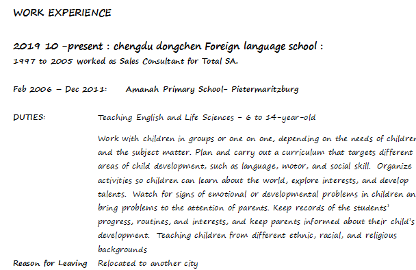 外教很穩(wěn)定 在南非有很長(zhǎng)的教學(xué)經(jīng)驗(yàn) 現(xiàn)在在成都某小學(xué)工作 求職成都職位 |