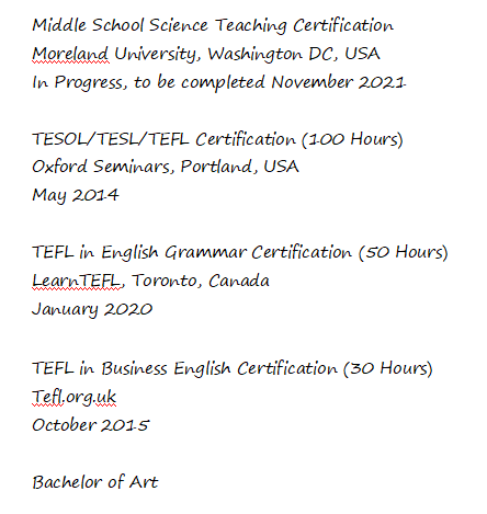 國(guó)籍: 孟加拉 求職意向: 教師
