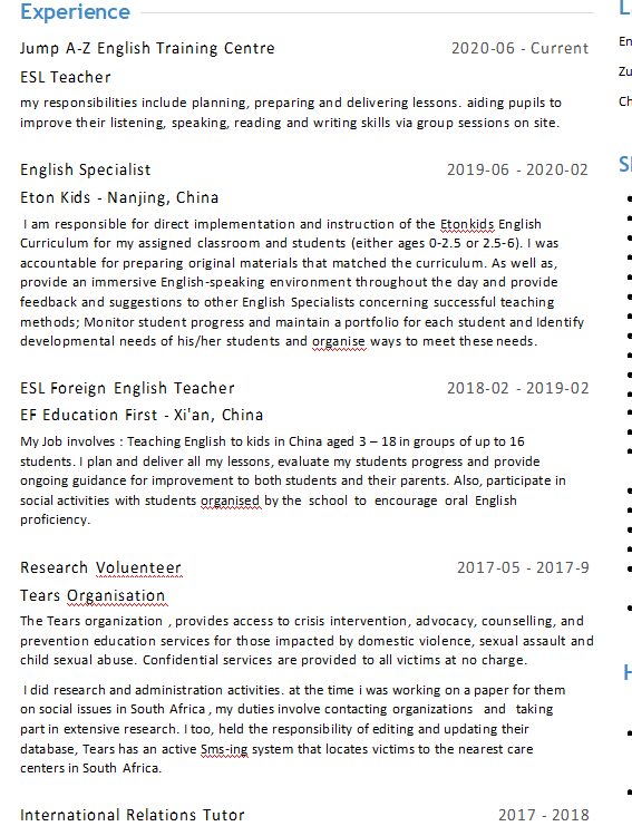國(guó)籍: 摩洛哥 求職意向: 教師