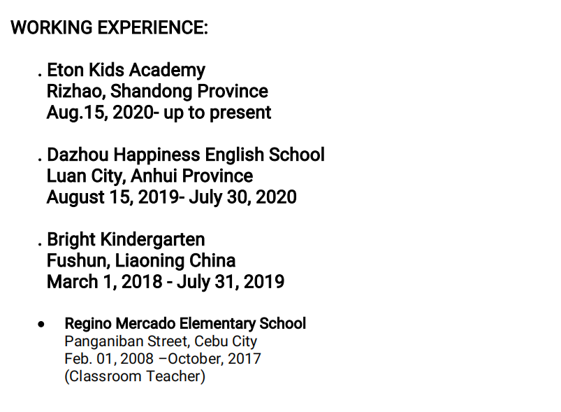 菲律賓,現(xiàn)居日照,本科-小學(xué)教育,求職幼兒園或培訓(xùn)中心,山東省的任何地方,工簽轉(zhuǎn),合同7.29到期,8月份可上崗 |