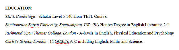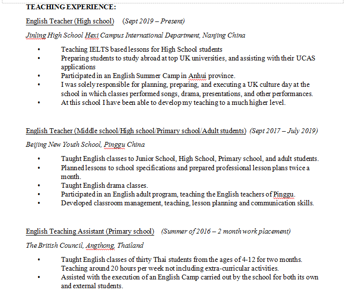 教學(xué)經(jīng)驗(yàn): 英語老師(高中)(2019年9月–至今) 南京市金陵中學(xué)河西校區(qū)國際部 ?針對高中生的基于雅思考試的課程 ?為學(xué)生做好在英國頂尖大學(xué)出國留學(xué)的準(zhǔn)備,并協(xié)助他們的UCAS申請 ?參加安徽省英語夏令營。 ?我全權(quán)負(fù)責(zé)在學(xué)校計(jì)劃,準(zhǔn)備和執(zhí)行英國文化日,在該日中,班級(jí)會(huì)表演歌曲,戲劇,演講和其他表演。 ?在這所學(xué)校,我能夠?qū)⒆约旱慕虒W(xué)發(fā)展到更高的水平。 英語老師(中學(xué)/高中/小學(xué)/成人)(2017年9月– 2019年7月) 中國平谷市北京新青年學(xué)校 ?面向初中,高中,小學(xué)和成人學(xué)生開設(shè)英語課程。 ?根據(jù)學(xué)校要求計(jì)劃課程,并每月準(zhǔn)備兩次專業(yè)課程計(jì)劃。 ?英語戲劇課。 ?參加成人英語課程,教平谷英語老師。 ?發(fā)展課堂管理,教學(xué),課程計(jì)劃和溝通技巧。 英語助教(小學(xué))(2016年夏季– 2個(gè)月的工作安排) 英國文化協(xié)會(huì),泰國安通 ?授課的英語班由30名4-12歲的泰國學(xué)生組成,為期兩個(gè)月。每周大約20個(gè)小時(shí)的教學(xué)時(shí)間,不包括課外活動(dòng)。 ?協(xié)助學(xué)校執(zhí)行針對自己和外部學(xué)生的英語夏令營。 教育: 劍橋TEFL-學(xué)者5140小時(shí)TEFL課程。 英國南安普敦,南安普敦索倫特大學(xué),英語文學(xué)學(xué)士學(xué)位,2:1 倫敦泰晤士河畔里士滿學(xué)院-英語,體育和心理學(xué)高級(jí)水平 倫敦基督學(xué)校-11 GCSE的A-C,包括英語,數(shù)學(xué)和科學(xué)。 |