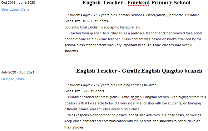 國籍: 其他 求職意向: 教師