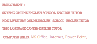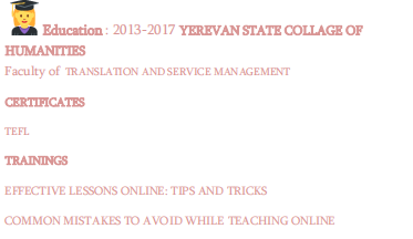 學(xué)歷:2013-2017年埃里溫州立學(xué)院 人文學(xué)科 翻譯和服務(wù)管理學(xué)院 證書 外語教學(xué)tefl 培訓(xùn) 有效的在線課程:技巧和技巧 在線教學(xué)時應(yīng)避免的常見錯誤 就業(yè): 斯基英在線英語學(xué)校英語家教 胡里在線英語學(xué)校-英語家教 |
