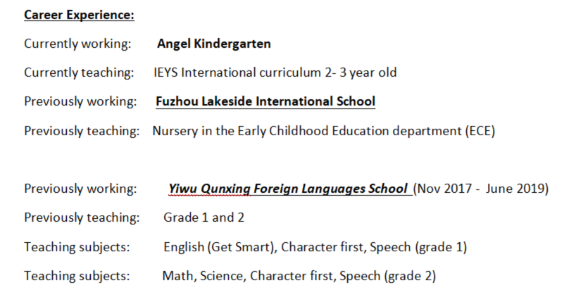 國籍: 其他 求職意向: 教師