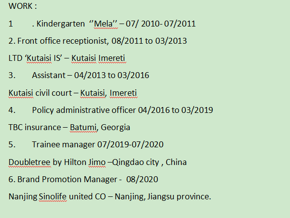 Ellen+格魯吉亞女+法律專業(yè)本科+經(jīng)濟類工簽轉(zhuǎn)(7.31)+求職江蘇省任何城市+目前在南京,7月到崗 |