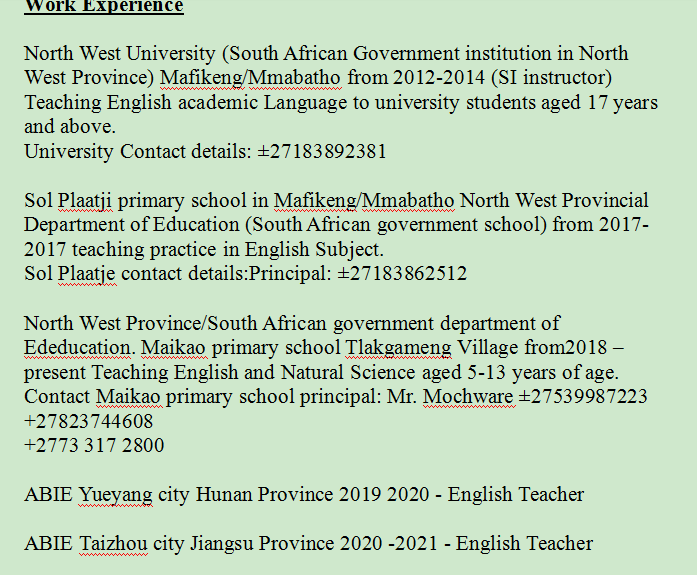 國(guó)籍: 摩洛哥 求職意向: 教師