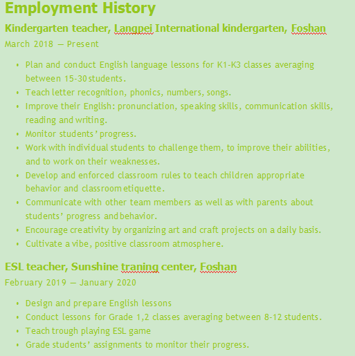 自我介紹,介紹年齡,國籍,學(xué)歷,中國教學(xué)經(jīng)歷,熱愛教育,喜歡孩子,優(yōu)勢(shì),學(xué)習(xí)能力也很強(qiáng),和家人在中國
