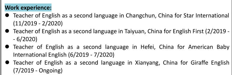 文教類工簽轉(zhuǎn)聘, 有幼兒園和公立和培訓中心的教學經(jīng)驗 |