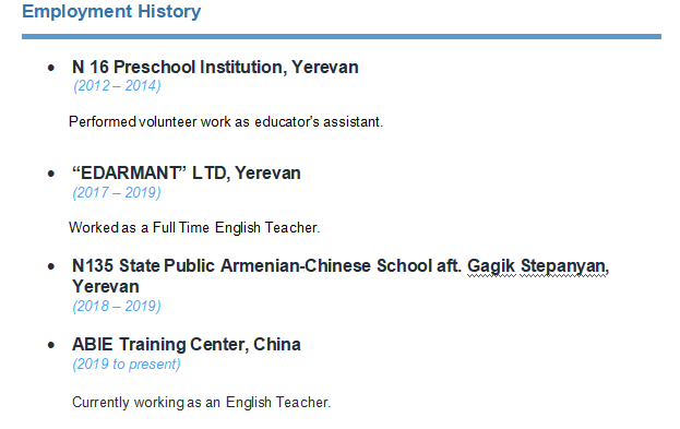 亞美尼亞 英語(yǔ) 碩士,在天津,目前文教類轉(zhuǎn)聘, 求職不限制, 協(xié)商薪資。 |