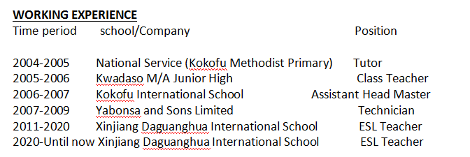 國籍: 加納 求職意向: 教師