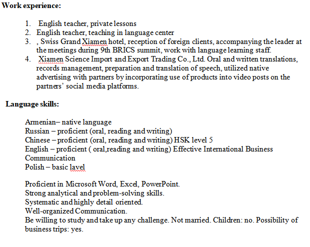 國(guó)籍: 亞美尼亞 求職意向: 教師