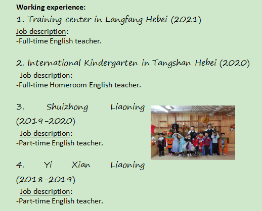 自我介紹,介紹年齡,在中國6年了,4年教學(xué)經(jīng)驗(yàn),幼兒園和培訓(xùn)都有經(jīng)驗(yàn),教學(xué)方式多樣,保證學(xué)生的學(xué)習(xí)興趣