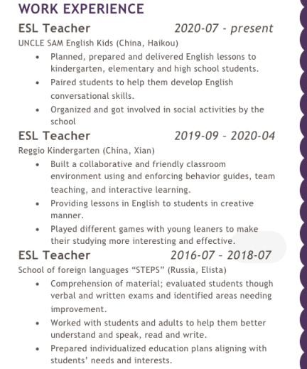 俄羅斯,本科語言(英語和漢語專業(yè)) 在???, 文教類簽證轉聘7月。 ,經驗4年多, 求職上海,浙杭職位 |
