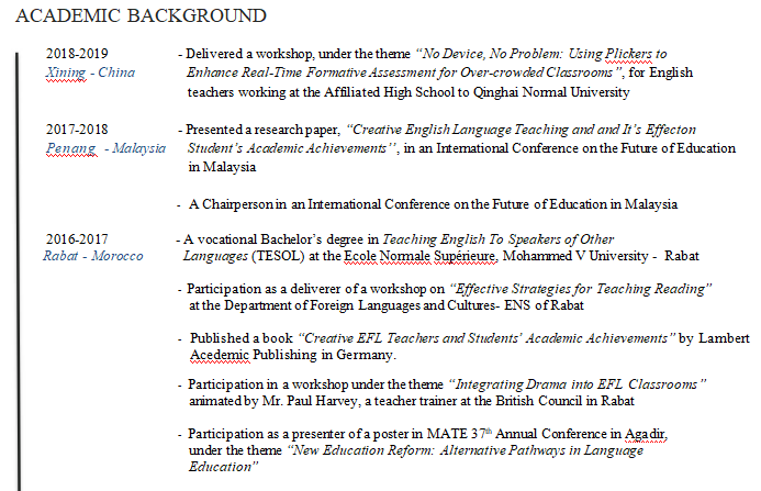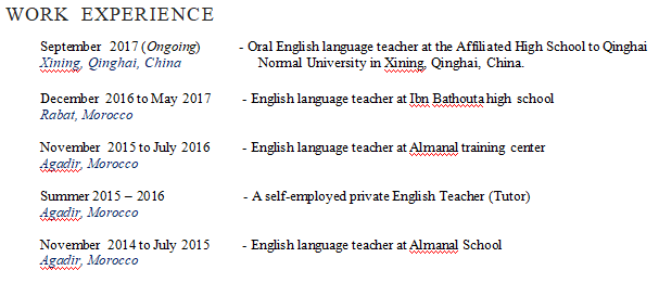 摩洛哥, 在濟寧, 工作簽轉聘在7月 2021. , 本科 英語教育, tefl, 有豐富經驗-高中, 培訓班經驗 |
