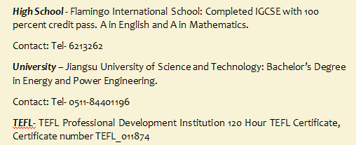 國籍: 澳大利亞 求職意向: 教師