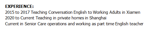 外教有教學經(jīng)驗 丈夫中國人 碩士學位 口音不錯 住上海虹口 求職上海 |