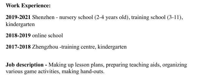 有愛心, 喜歡小朋友,求職培訓(xùn)中心和幼兒園都行, 教學(xué)經(jīng)驗(yàn)豐富 |