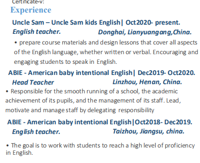 國籍: 其他 求職意向: 教師