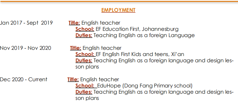 國(guó)籍: 南非 求職意向: 教師