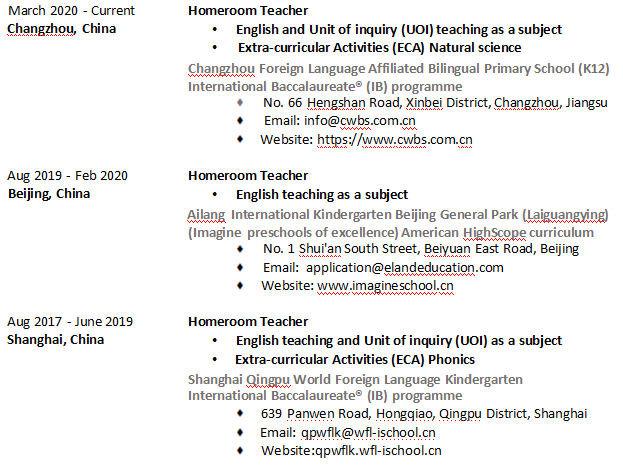 碩士,有TEFL, 傾向小學,幼兒園職位 |