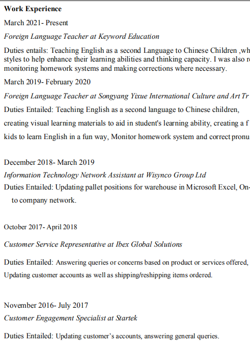 國(guó)籍: 南非 求職意向: 教師