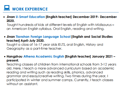 自我介紹,介紹年齡27,學(xué)歷,tefl,本國工作經(jīng)歷,中國教學(xué)經(jīng)驗,對每一份工作簡單介紹,教學(xué)內(nèi)容,學(xué)生年齡和水平,純正英音,形象好