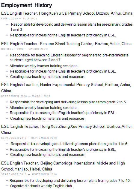 外教有6年多的教學(xué)經(jīng)驗 很穩(wěn)定 兩個本科 其中一個是教育類專業(yè) 文教類工簽 已經(jīng)解聘 求職上海及附近省份的工作 |