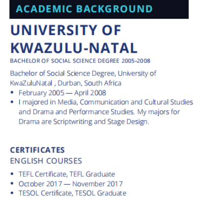 國籍: 南非 求職意向: 教師
