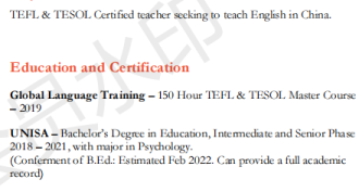 南非女外教英語母語國家外教 ,會德語, 目前南非 , 教育學本科, 知名南非大學。tefl/tesol 雙證全, 有中學高中教學經(jīng)驗, 求職中國職位,求職長期教學工作。 也可以教授數(shù)學。 薪資協(xié)商 |