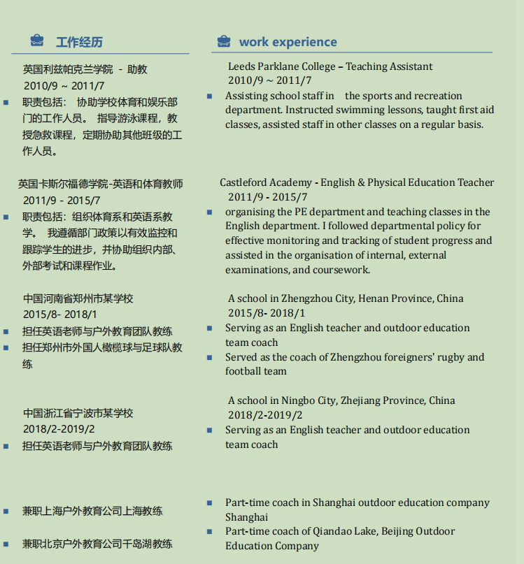 是一名前職業(yè)橄欖球 運(yùn)動(dòng)員。于 2015 年來(lái)到中國(guó), 在這里生活 和工作了 7 年。 喜歡積極健康的生活方式,并進(jìn) 行大量體育鍛煉。 我喜歡在當(dāng)?shù)鼐?樂(lè)部踢足球和執(zhí)教橄欖球,喜歡社 交和出國(guó)旅游, 可以教體育,或者英語(yǔ), 希望在公私立學(xué)校工作 |