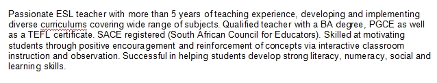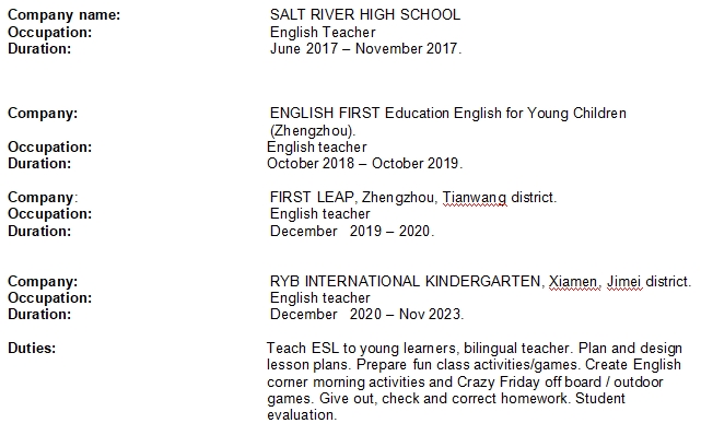 國籍: 南非 求職意向: 教師