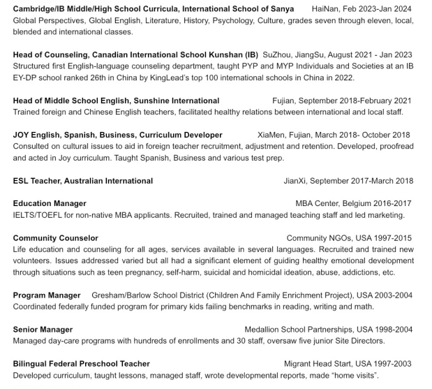國籍: 美國 求職意向: 教師